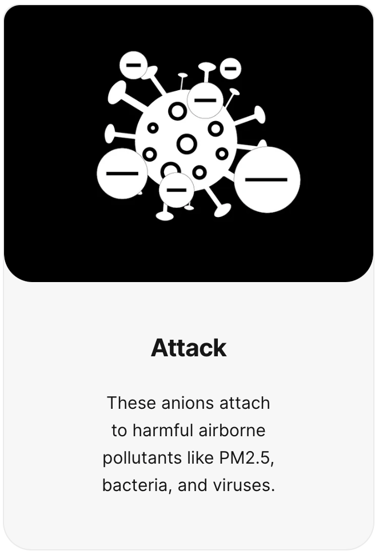 The science behind this portable air purifier device is Advanced Variable Anion Technology, designed to release millions of anions into the air every second. These anions attach to harmful airborne particles such as PM2.5, PM10, bacteria, viruses, pollen, and pet dander, neutralising them and improving the air quality around you.